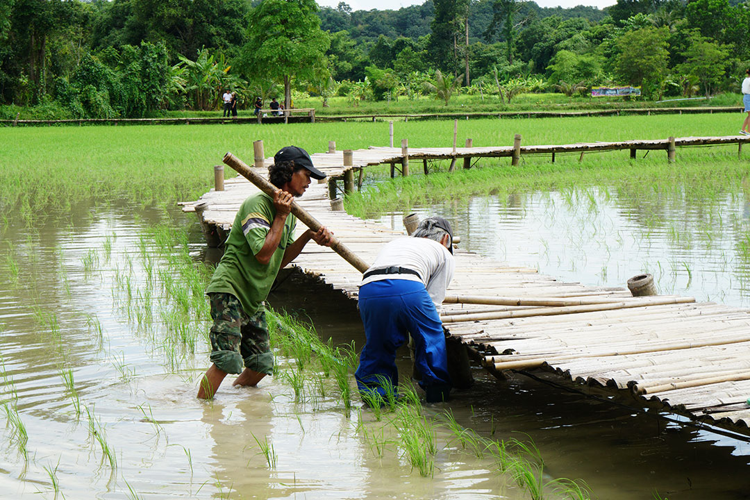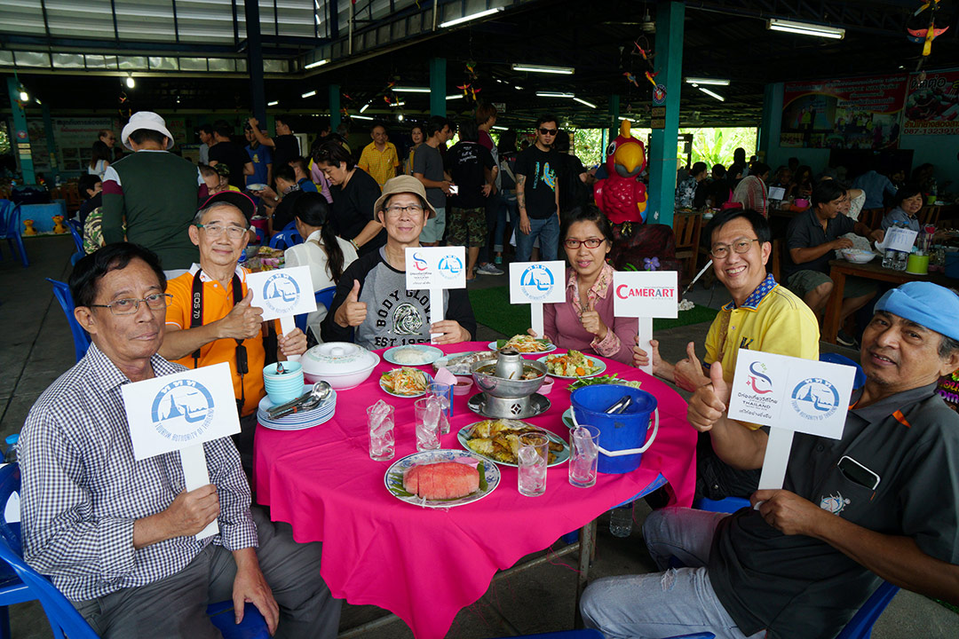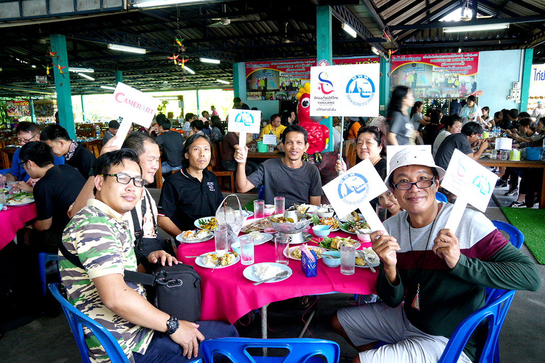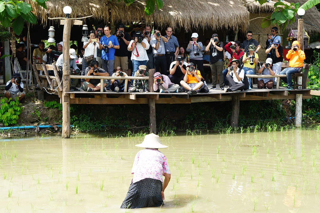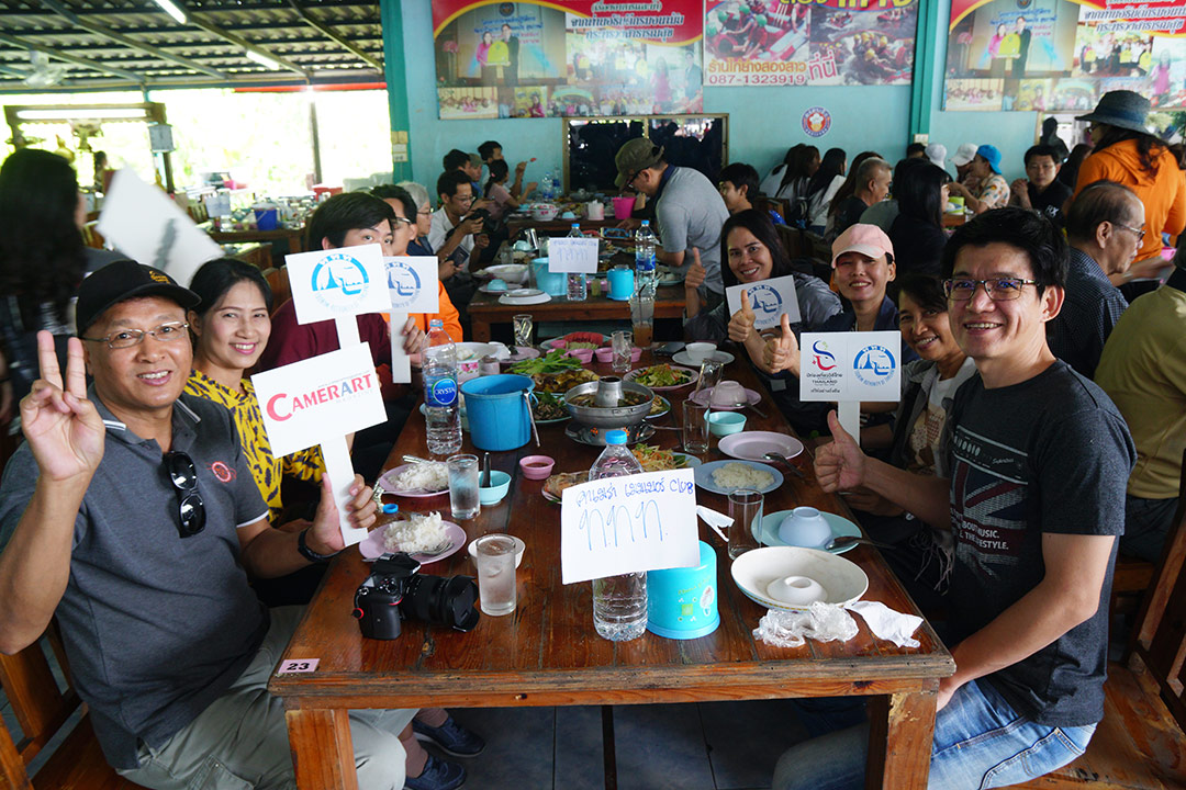 ระหว่างรอ ก็เดินเก็บภาพกันไปเรื่อย จนได้ยินเสียงร้องโวยวาย…อ้าว…เสารองสะพาหัก เกือบเทกระจาดนักท่องเที่ยวลงไปดำนาแทนแล้ว ช่วงที่เราไปนักท่องเที่ยวเยอะจริงๆ… แค่คณะ CAMERART ก็ 80 กว่าคนไปแล้ว คุณอ๊อด เลยขอตัวไปซ่อมสะพานก่อน ช่วงระหว่างรอการซ่อมสะพาน ก๊วนแก็งค์ CAMERART ก็รอเก็บภาพช็อตเด็ด เพื่อจะมีเพื่อนๆ CAMERART คนไหนล่วงลงน้ำบ้าง จะได้เป็นดาราหน้ากล้อง ยิ่งกว่าเจอกองทัพนักข่าวอีก 555… แต่ทุกคนก็ไม่มีใครพลาด เข้าทำสะพานแข็งแรงอยู่… แม้จะใช้วัสดุจากธรรมชาติ สไตล์ ECO แนวรักษ์โลก เป็นมิตรกับสิ่งแวดล้อม ที่กำลังเป็นกระแสนิยมในช่วงนี้ ทุ่งนามุ้ย จัดว่าเป็นอีกแหล่งท่องเที่ยวที่เป็นมิตรกับสิ่งแวดล้อม พอ คุณอ๊อด ทำการซ่อมแซมสะพานเรียบร้อย เราก็ได้เกียรติจากคุณแม่ค้า ที่อาสามาเป็นแบบแสดงการดำนา เป็นชาวนาที่อารมณ์ดีมาก โชว์ฟ้อนรำเรียกรอยยิ้มให้พวกเราทุกๆ คนได้อย่างดี เก็บภาพการสาธิตการดำนาไปก็รอยยิ้มเปื้อนหน้ากันไป นี่แหละความสุขของการถ่ายภาพ จนหลายคนถามว่าไปที่เดิมๆ บ่อยๆ ไม่เบื่อบ้างเหรอ ต้องบอกว่าไม่เคยเบื่อเลย เพราะชอบบรรยากาศการของเดินทาง ซึ่งมันไม่สามารถหาอ่านเอาจากหนังสือ หรือแค่ดูภาพถ่าย มันเป็นความรู้สึกที่หาได้เมื่อออกเดินทางเท่านั้น นี่เองอาจจะเป็นเหตุผลที่ทริป CAMERART เต็มเร็วมาก ไม่ใช่แค่สถานที่ท่องเที่ยว แต่มันคือ มิตรภาพ และความสุขของการได้เดินทางกลับใครหลายๆ คน ที่ชอบในเรื่องเดียวกัน และที่สำคัญทริป CAMERART ไม่เคยจำกัดว่าต้องใช้กล้องถ่ายภาพค่ายไหน ไม่ว่าจะเป็น DSLR, Mirrorless หรือแม้แต่โทรศัพท์ถ่ายภาพ ก็สามารถร่วมทริปกับ CAMERART ที่นี่เราไม่แบ่งค่าย และรุ่นกล้อง แค่คุณมีหัวใจที่รักในการถ่ายภาพก็สามารถมาร่วมทริปกับเราได้ทั้งนั้น นี่อาจจะเป็นอีกหนึ่งเหตุผลที่หลายต่อหลายคนหลั่งไหลมาร่วมกิจกรรมกับเรา เป็นอีกหนึ่งความฮอตฮิตของทริป CAMERART โปรแกรมยังไม่ออกก็จองกันแล้ว ขอบคุณทุกความไว้วางใจที่มีเรา eyejung เองที่อยู่ในฐานะผู้จัด ก็รู้สึกขอบคุณทุกๆ ท่าน ที่มั่นใจว่าเราจะเลือกสถานที่ ที่ให้ทุกคนได้เลือกมุมมองในการถ่ายภาพของตัวเองได้ทุกทริป