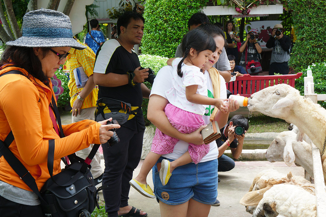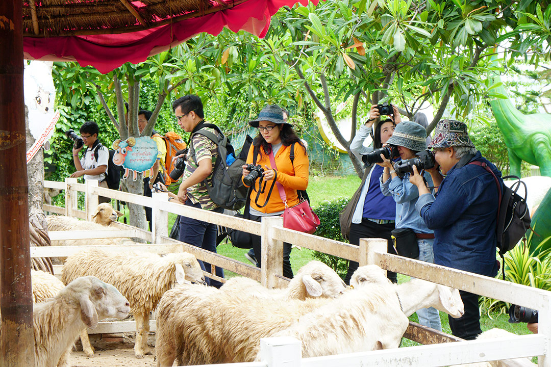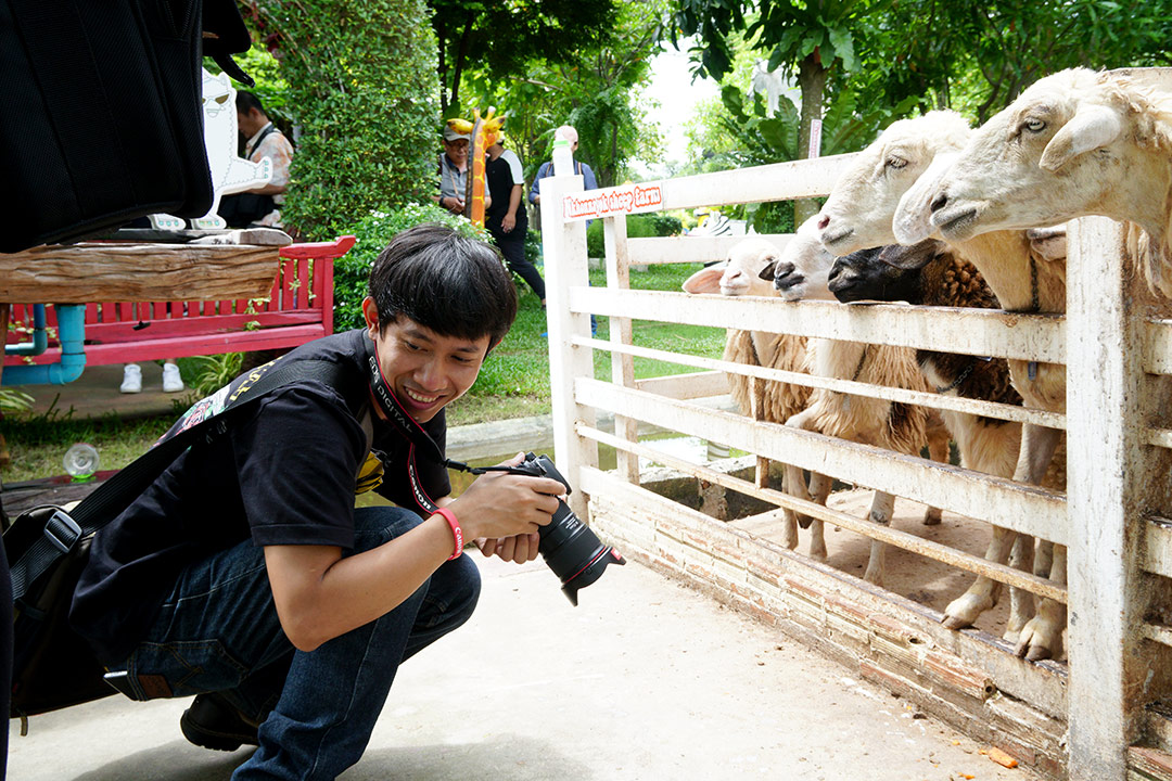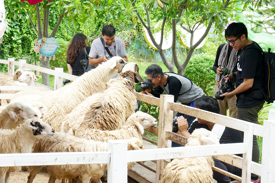 จากซุ้มอุโมงค์ป่าไผ่ เราออกเดินทางกันมาต่อมาที่ Khonyok Sheep Farm ฟาร์มแกะที่นครนายก ตั้งอยู่ริมถนนเส้นทางหลวงหมายเลข 3049 อยู่ติดกับ ตลาดเท่งเทิดเทิง แต่ตลาดเท่งเทิดเทิง เขาจะเปิดช่วงเย็น ใน Khonyok Sheep Farm จะมีฝูงแกะน่ารักๆ รอต้อนรับพวกเราอยู่ โดยเสียค่าบัตรผ่านประตูคนละ 50 บาท แต่ทริปนี้อาจารย์ใจปล้ำออกค่าเข้าให้ทุกคนเลย เป็นความพิเศษชั้นที่ 1 ที่ CAMERART มอบให้ เมื่อเข้าสู่ Khonyok Sheep Farm เหมือนเข้าสู่โลกแห่งการ์ตูนด้วยสีสันของเหล่าตัวการ์ตูน และกิจกรรมสุดสร้างสรรค์ กิจกรรมเด็กเลี้ยงแกะ ด้วยการให้ซื้ออาหารมาป้อนแกะ หรือจะเป็นผู้ใหญ่เลี้ยงแกะก็ได้นะ นอกจากแกะแล้ว ด้านในยังมีสัตว์อื่นๆ น้องม้า และปลานะคาร์ฟ (ปลาคาร์ฟ) 555.. จะเล่นทำไมเนี่ย ถ่ายภาพกันเหนื่อยๆ ก็มาพักหลบร้อนได้ที่ร้านกาแฟด้านหน้า ที่ตกแต่งอย่างหรูหรา ในราคาที่หรูหราตามไปด้วยนิดหนึ่ง มานั่งดับร้อน ถ่ายภาพ Portrait เก๋ๆ ในร้าน ได้อีกด้วย ดื่มกาแฟดับร้อนได้เวลาพักทานอาหารเที่ยง ถึงเวลาที่ eyejung ต้องออกตามทุกคนอีกใช่มั้ยเนี่ย หลายคนบ่นไม่ชอบช่างเวลานี้ที่สุด 555… พอบอกให้ขึ้นรถ นี่นึกมุมที่อยากถ่ายออกกันตลอด แล้วเหมือน eyejung มาขัดจังหวะ มันต้องเป็นอย่างนี่ทุกที่สิน่า จะแกล้ง eyejung ใช่มั้ยเนี่ย