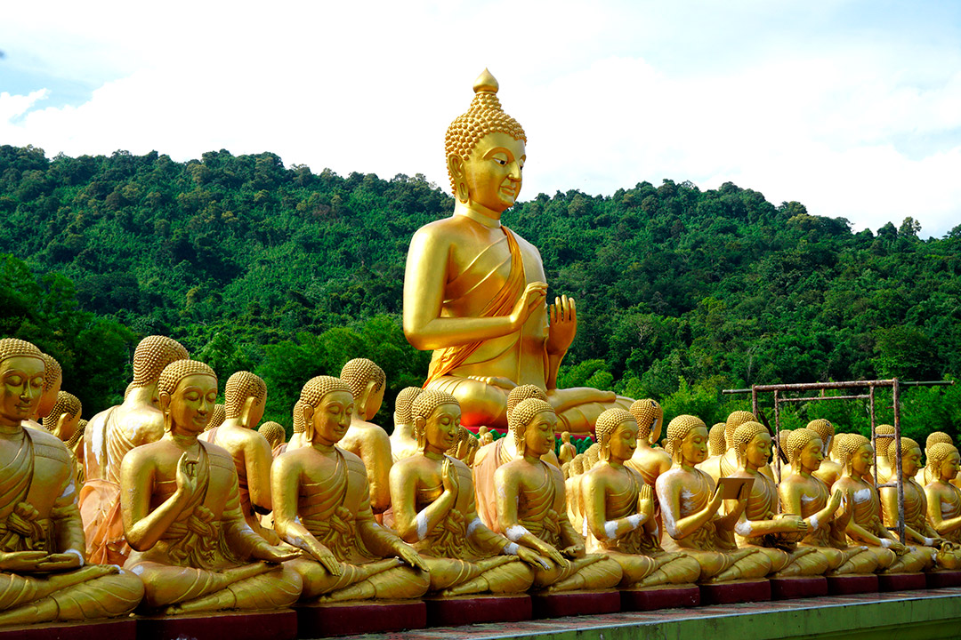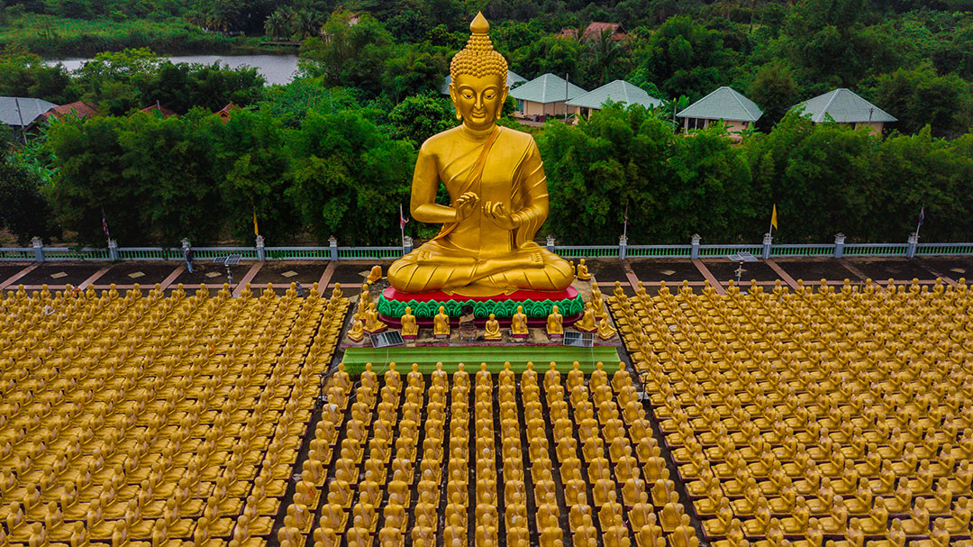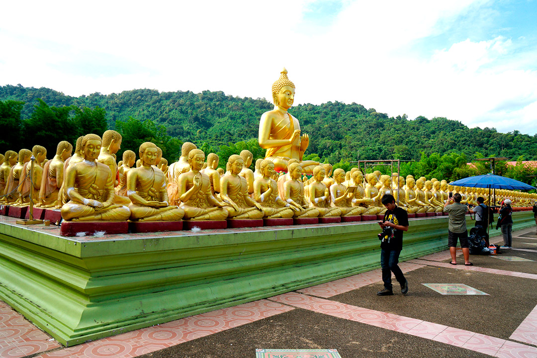 มุมถ่ายของ พุทธอุทยานมาฆบูชาอนุสรณ์ ถ้าอยากให้เห็นถึงภาพความอลังการของพระพุทธเจ้าองค์ใหญ่หน้าตักที่ กำลังแสดงโอวาทปาติโมกข์ โดยมีสาวก 1,250 รูปนั่งประนมมือล้อมพระพุทธองค์เป็นรูปวงกลม นั้นต้องขึ้นมุมสูง ซึ่งเราเคยขอให้ทางพุทธอุทยานมาฆบูชาอนุสรณ์ จัดนั่งร้านให้เรา เพื่อขึ้นไปเก็บภาพมุมสูง ซึ่งปัจจุบันการถ่ายภาพมุมสูงไม่ใช่เรื่องยากอีกต่อไป แค่มีโดรนก็สามารถเก็บภาพได้อย่างสวยงาม แต่อย่าลืมต้องลงทะเบียนกันก่อนนะคะ เดี๋ยวนี้มีกฎหมายออกมาจัดระเบียบโดรนกัน จะได้ไม่มีปัญหาตามมาที่หลัง จากลานพระพุทธรูป 1,250 รูป ปัจจุบันมีการสร้างพระพิฆเนศ องค์ใหญ่ด้านหน้าเพิ่มอีก 1 องค์ จุดนี้เราให้เวลากันเต็มที่จนถึง 5 โมงเย็น แต่พอเราจะออกรถแล้ว มีเสียงตะโกนมาว่า พี่นที หายไป งานนี้ คุณทรงพล ได้ออกแรงจะวิ่งลงไปตาม แต่ eyejung ให้พระช่วยประกาศตามหาดีกว่า เพราะพื้นที่ค่อนข้างกว้างไม่รู้ว่าจะไปตามตรงไหน ประกาศปุ๊บ พี่นทีบอกว่า… เขารู้ชื่อกันหมดเลย 555… นานๆ มาที อาจจะเพลินไปหน่อย อิอิ… จาก พุทธอุทยานมาฆบูชาอนุสรณ์ เดินทางมายังจุดสุดท้ายตลาดยามเย็นเท่งเทิดเทิง แต่เราหาที่จอดรถกันไม่ได้ ทุกคนเลยบอกไม่ทานอาหารเย็นก็ได้ อยากกลับไปให้ทันดูบอลโลกรอบตัดเชือก… รีเควส กันมาแบบนี้มีหรือ eyejung จะไม่จัดให้ เมื่อขอมาก็จัดให้ใจดีอยู่แล้ว (อย่านึกถึงโดนตามขึ้นรถกันล่ะ 555…) ทริปนี้เราเลยผ่านตลาดเท่งเทิดเทิงไป มีแต่ทีมรถตู้ที่จอดแวะได้ คำแสนถึงกลับออกปากว่าทำไมถึงทิ้งกัน อิอิ… Bye…eyejung