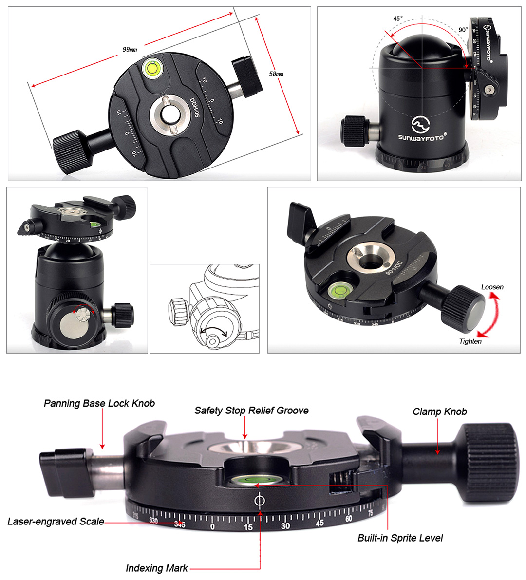 ฟังก์ชั่นการใช้งานของ SunwayFoto FB-36 II DDHi ส่วนด้านล่างมีสเกลองศาบอกว่าเราตั้งอยู่ที่องศาที่เท่าไหร่มี Mark ไว้ให้สังเกตได้ ใช้สำหรับการตั้งถ่าย Panorama เวลา Pan กล้องถ่ายทำให้เรากำหนดองศาได้เลย