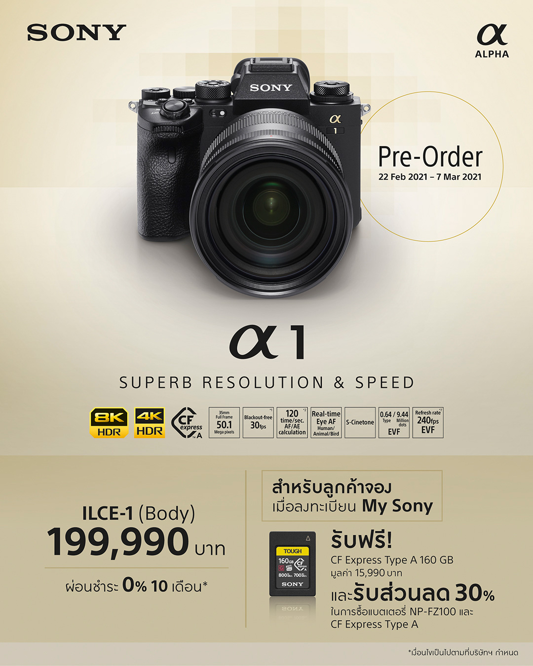 - รับโค้ดส่วนลด 30% สำหรับซื้อแบตเตอรี่ รุ่น NP-FZ100 และเมมโมรีการ์ด CF Express Type A ความจุ 160 GB หรือ 80 GB ที่ Sony Store Online (store.sony.co.th) ซึ่งโค้ดส่วนลด จะเริ่มส่ง