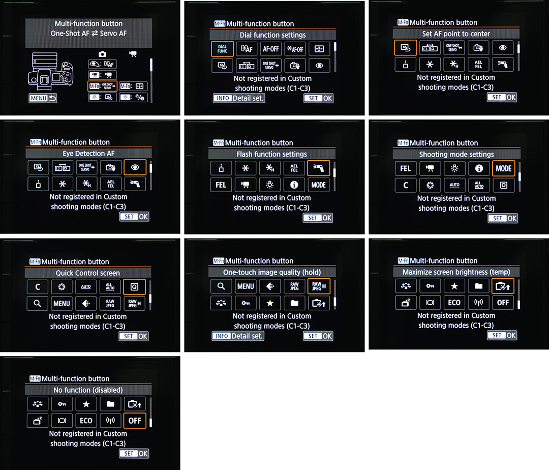 แม้แต่การเลือกรูปแบบของจุดโฟกัส คุณก็สามารถ Customเอาปุ่มใดปุ่มหนึ่งมาใช้งานได้ทันที ทั้งนี้ยังไม่นับในเรื่องอื่นๆ อย่างเช่น การล็อคค่าแสง ล็อคโฟกัส การเลื่อนโฟกัสในระบบ Touch Screen แม้แต่เลือกให้เป็นปุ่มสำหรับ Eye Detection AF ไปจนถึง Flash function settings รวมทั้ง การตั้ง Picture Style