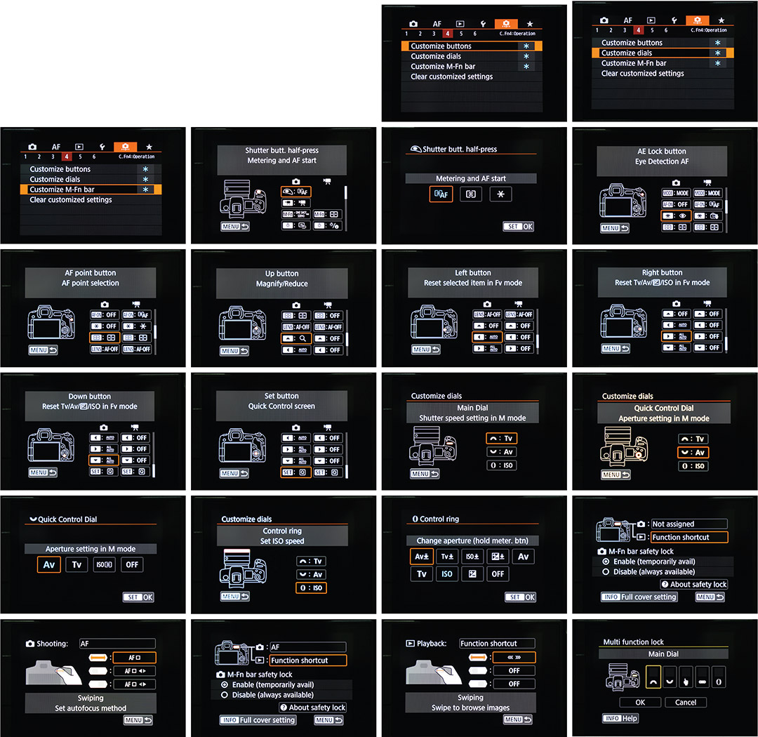หลายท่านอาจจะบอกว่า การตั้งค่าปุ่มใช้งานก็เคยมีมาแล้วแต่ Canon EOS R ในวันนี้สามารถทำได้มากกว่า เพียงเข้าไปตั้งค่าใน เมนู Custom ซึ่งสามารถตั้ง Custom ได้ทั้ง ปุ่มบังคับต่างๆ แหวน Dial และ M-Fn Bar ซึ่งสามารถเลือกใช้งานได้กว่า 30-39 รายการ หลายท่านอาจจะถามว่า ยุ่งยากไหม… ตอบได้เลยครับว่า ไม่ยุ่งยากเลย เข้าใจง่าย ด้วยกราฟฟิคที่มีมาให้ เพียงแต่เลือกสิ่งที่ต้องการใช้แล้วกดยืนยัน