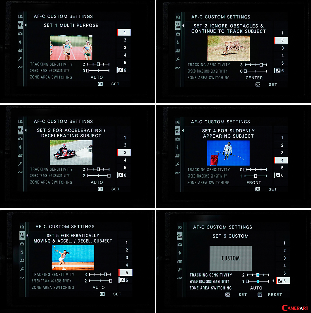 AF-C Custom Setting เป็นเมนูสำหรับเลือกรูปแบบการทำงานของ AF-C กับการโฟกัสติดตามวัตถุ (Tracking) ระบบนี้ให้ความสะดวกสำหรับนักถ่ายภาพที่ต้องการถ่ายภาพในแนว Action เกือบทุกรูปแบบ มีให้เลือกใช้งานเป็นอัตโนมัติ 5 รูปแบบ และการปรับตั้งเอง 1 รูปแบบ ดังนี้