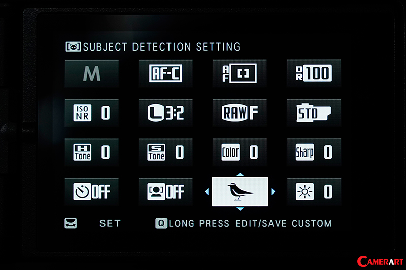 Subject Detection Setting เป็นอีกเมนูหนึ่งที่มีมาใหม่ให้เลือกใช้หมวดหมู่เมนู AF/MF Setting เช่นกัน เมนูนี้เป็นเมนูที่เกี่ยวข้องกับวัตถุที่จะถ่ายภาพ ด้วยระบบ AI ของกล้องในการจับโฟกัสหาวัตถุที่ต้องการถ่ายภาพ เมื่อกดเข้าไปจะมีให้เลือกได้ตั้งแต่ Animal, Bird, Automobile, Motocycle & Bike, Airplane และ Train