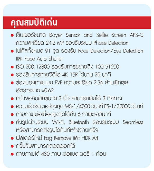 จากที่ได้ทดลองใช้งานมาระยะหนึ่ง สิ่งที่รู้สึกได้อย่างชัดเจนว่ากล้องตัวเล็กๆ รุ่นนี้มีระบบโฟกัสที่รวดเร็วว่องไว และแม่นยำดีมาก รวมถึงการโฟกัสแบบติดตามวัตถุที่มีการเคลื่อนที่ก็ทำได้เป็นอย่างดี คุณภาพของภาพที่ได้น่าประทับใจมาก ความเร็วในการถ่ายภาพต่อเนื่องที่ 6 ภาพต่อวินาที อาจจะดูน้อยไปนิด แต่ก็ถือว่าเป็นความเร็วแบบมาตรฐานของกล้องในระดับของผู้เริ่มต้น ถ้าจับจังหวะดีๆ ก็ทำให้ไม่พลาดภาพในช็อตที่สำคัญได้เช่นกัน มี hot shoe TTL ที่ใช้งานร่วมกับแฟลชสตูดิโอได้ทุกรูปแบบเพื่อถ่ายภาพอย่างมืออาชีพได้สบายๆ