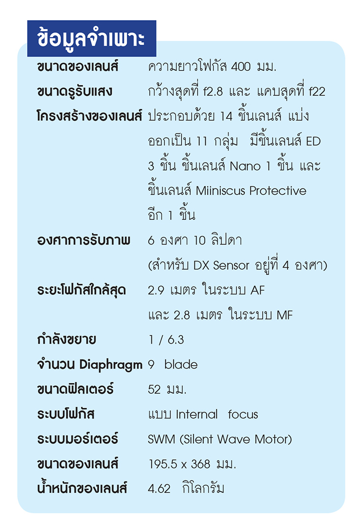 AF-S Nikkor 400 มม. f2.8 G ED VR จัดเป็นเลนส์ Super Telephoto มีขนาดความยาวโฟกัส 400 มม. มีขนาดรูรับแสงกว้างสุดที่ f2.8 เลนส์ เลนส์รุ่นมาพร้อมกับ Case บรรจุแน่นหนา พร้อม Hood และ Filter Holder ขนาด 52 มม. มีสายสะพายคล้องเลนส์มาให้พร้อมใช้งาน