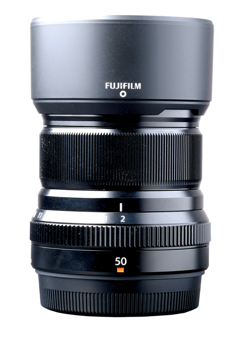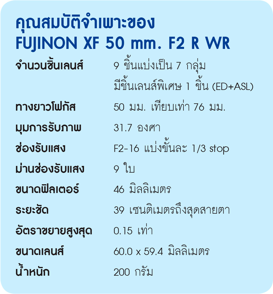 FUJINON XF 50 mm. F2 R WR มีทางยาวโฟกัสเทียบเท่าเลนส์ 76 มม. (Full Frame) จัดเป็นเลนส์เทเลโฟโต้ระดับเริ่มต้นที่เหมาะกับการถ่ายภาพบุคคล ระยะห่างไม่ไกลจากตัวแบบนักเวลาถ่ายภาพครึ่งตัว ตัวเลนส์ออกแบบไว้อย่างจัดเต็มมาก ใช้ชิ้นเลนส์ ED+Aspherical คือเอาแก้ว ED มาทำชิ้นเลนส์ Aspherical ซึ่งมีไม่กี่ผู้ผลิตที่ทำแบบนี้ได้ จำนวนชิ้นเลนส์ทั้งหมด 9 ชิ้น แบ่งเป็น 7 กลุ่ม ตัวกระบอกเลนส์เป็นอลูมิเนียมอัลลอยด์ เคลือบสีแบบอโนไดซ์มีสีดำและเงินให้เลือก มอเตอร์ขับเคลื่อนใช้ Stepping Motor ที่เหมาะกับเลนส์ตัวเล็กๆ โฟกัสเร็วปรี๊ดๆ เงียบ และนุ่มนวล มีระบบ Weather Seal ป้องกันน้ำและฝุ่นละอองเวลาต้องไปใช้งานในสภาพที่โหดๆ ทำงานได้ถึง -10 องศา