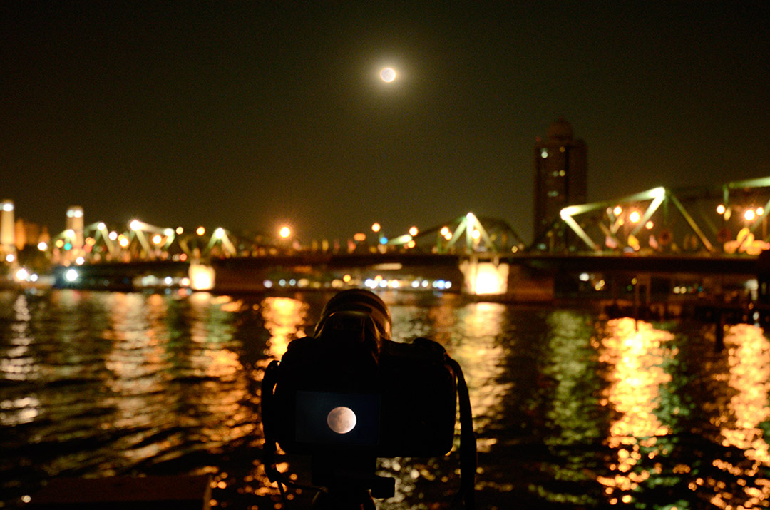 จันทรุปราคา นับว่าเป็นโอกาสที่จะถ่ายภาพได้ไม่บ่อยครั้ง เพราะนานๆ จะเกิดขึ้นในช่วงเวลาและสภาพอากาศที่เหมาะสม จันทรุปราคาภาพที่ได้ดวงจันทร์จะค่อยๆ เปลี่ยนจากสีเหลือง จนเมื่อจันทรุปราคาเต็มดวงก็จะเป็นสีแดง ทำให้ภาพถ่ายที่ได้สวยงามแปลกตา และมีระยะเวลาในการถ่ายภาพพอสมควร สิ่งสำคัญคือการหาฉากมาประกอบในภาพให้ดูน่าสนใจกว่าการถ่ายภาพจันทรุปราคาเปล่าๆ อย่างภาพที่นำมาประกอบในครั้งนี้ ผมใช้กล้องถ่ายภาพอีกตัวหนึ่งเปิด live view ในกล้องให้แสดงภาพจันทรุปราคา และใช้กล้องอีกตัวถ่ายภาพ โดยให้เห็นบรรยากาศริมแม่น้ำเจ้าพระยาด้วย