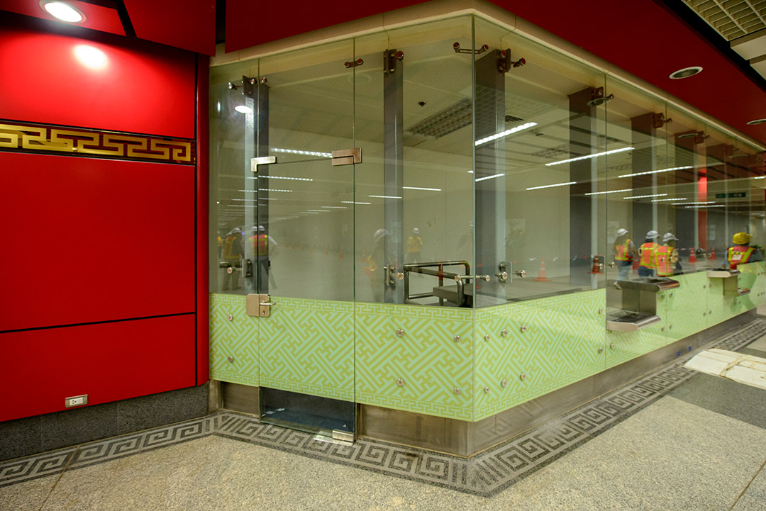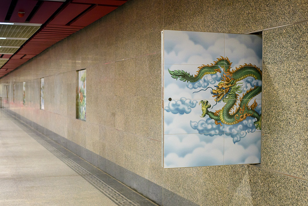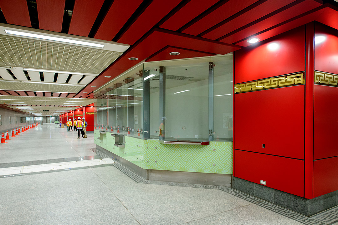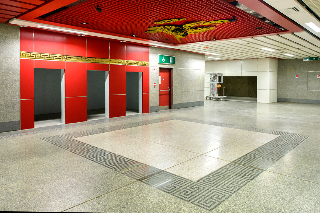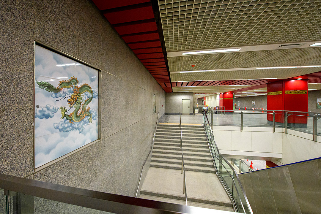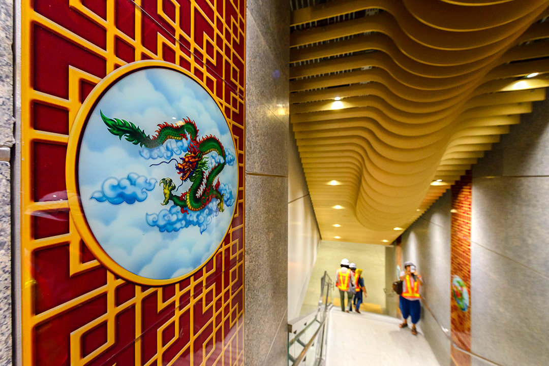 ไฮไลท์ที่โดดเด่นของสถานีวัดมังกรแห่งนี้ ก็คือ รูปปั้นมังกร ที่พาดลงมาจากเพดานบริเวณหน้าตู้จำหน่วยตั๋วอัตโนมัติ ซึ่งให้ความรู้สึกเหมือนมังกรกำลังจ้องมองลงมา ดูน่าเกรงขามและสวยงามมาก คาดว่าเมื่อเปิดใช้งานจุดนี้น่าจะเป็นจุดที่ผู้คนมาแวะถ่ายรูปกันมากที่สุด เราเดินต่อไปชั้นล่างบริเวณชานชาลา การตกแต่งจะเป็นในรูปแบบเดียวกับชั้นบนทุกประการ จุดเด่นที่คาดว่าพอนั่งรถไฟมาถึงสถานีวัดมังกรนี้ จะมองเห็นเสาลอยสีแดงเด่นกว่าใคร น่าจะใช้เป็นจุดสังเกตที่ดีของผู้เดินทางไปมาได้ว่ามาถึงสถานีวัดมังกรแล้ว