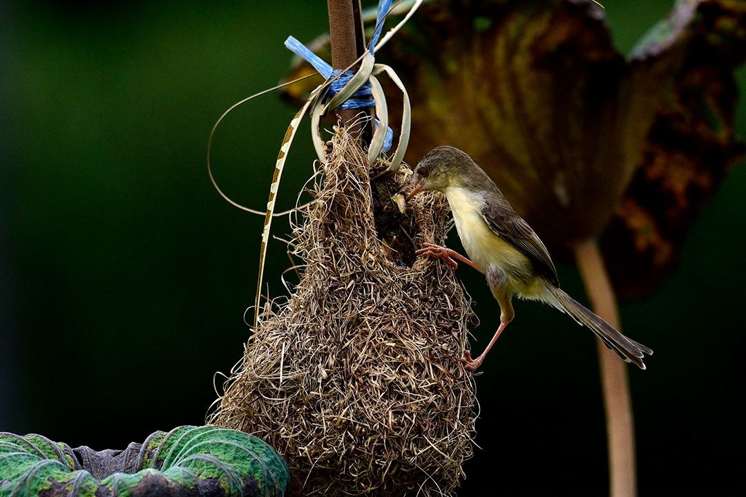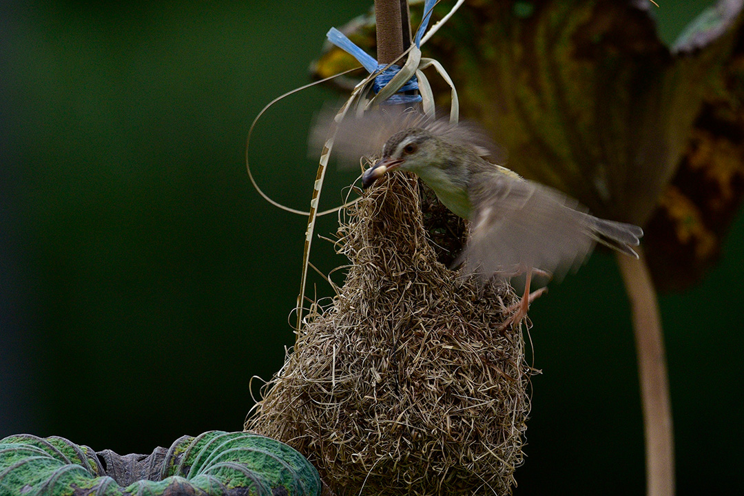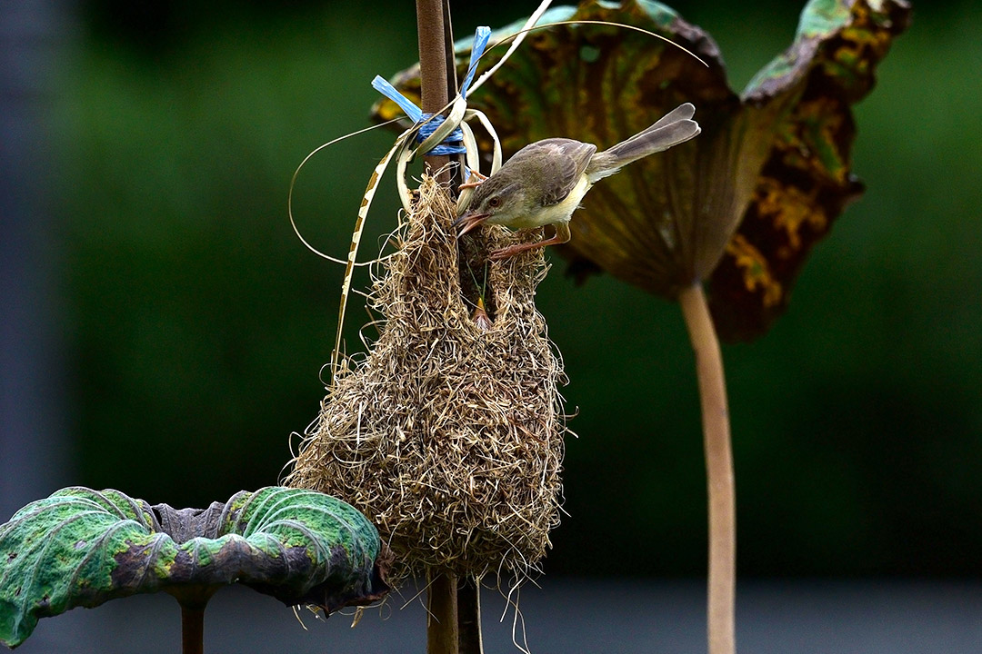 เริ่มจากการชี้ตำแหน่งของรังนก ซึ่งแม้จะอยู่ไม่ห่างนัก แต่ถ้าไม่ใช่นักสังเกตก็คงมองไม่เห็น หรือมองเห็น แต่รอบนี้ต้องบอกว่าเห็นง่าย เพราะบังเอิญ รักนกไปเกาะอยู่ที่กิ่งใบบัว ที่คนสวนผูกอยู่กับไม้พอดี จึงเห็นได้ง่าย