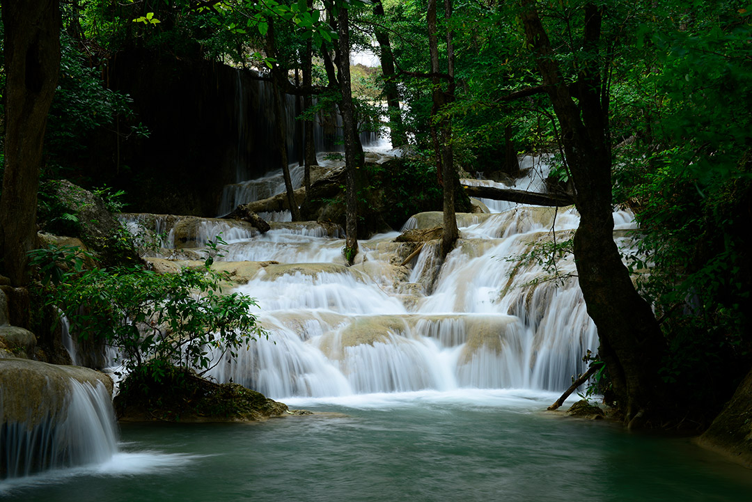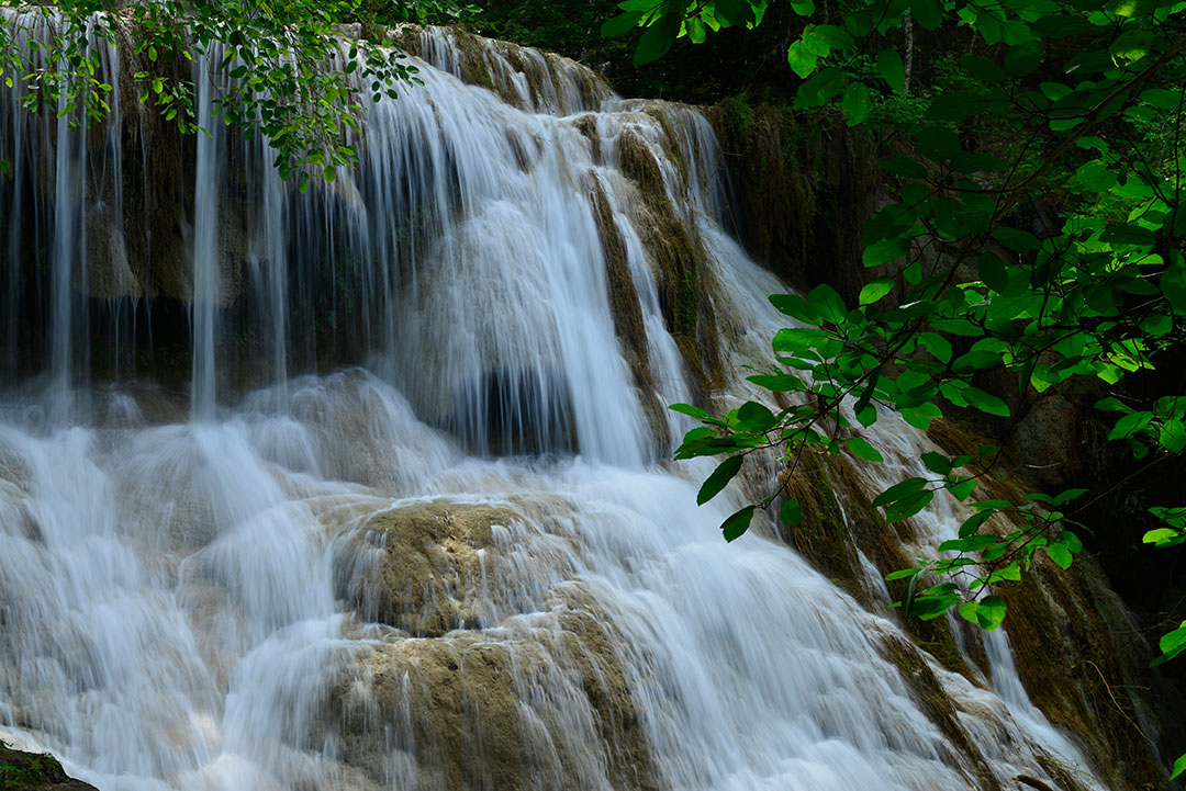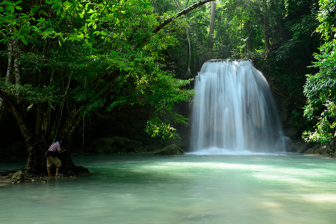 ดินแดนฝั่งตะวันตกเต็มไปด้วยเทือกเขาหินปูน จึงมีน้ำตก ถ้ำ ผืนป่าสวยงามมากมาย   น้ำตกเอราวัณเป็นน้ำตกที่สวยมากสุดแห่งหนึ่งของผืนป่าตะวันตก ทั้งยิ่งใหญ่ และงดงามไม่แพ้น้ำตกอย่างทีลอซู หมันแดง แม้ผมจะเดินทางไปน้ำตกเอราวัณหลายต่อหลายครั้ง แต่ก็ยังไม่เคยได้ภาพสวยถูกใจเลยแม้แต่ครั้งเดียว  เพราะว่าน้ำตกเอราวัณมีขนาดใหญ่มาก แต่ปริมาณน้ำมีน้อย ป่าต้นน้ำไม่ได้สมบูรณ์เหมือนในอดีต ต้องรอฝนตกลงมาอย่างหนักจนเกิดน้ำป่าหลากแล้วรอให้น้ำหายแดงจะเป็นจังหวะที่น้ำตกเอราวัณสวยที่สุด ซึ่งปีหนึ่งๆ น้ำตกเอราวัณจะสวยเพียงไม่กี่วัน หรืออาจจะไม่มีช่วงสวยเลยในปีนั้นๆ ก็ได้หากน้ำไม่มากพอ