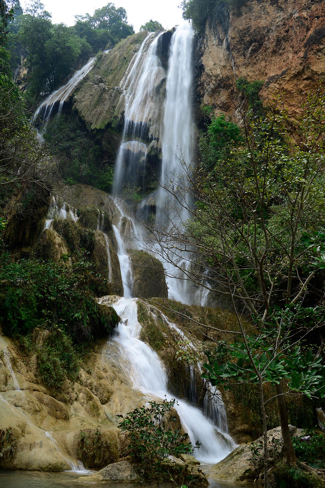 จากผาน้ำตกเราเดินขึ้นเขาไปชั้นท่าสวยน้อยที่สุดคือ อกผีเสื้อ เป็นน้ำตกชั้นเล็กๆ แถมมีคนไปอยู่บนน้ำตกเยอะมากจนผมต้องเดินผ่านไปเลยเพราะไม่รู้จะถ่ายภาพอย่างไร ไปต่อที่ชั้น 5 คือเบื่อไม่ลง ระยะห่างของสองชั้นนี้ค่อนข้างไกลต้องเดินอย่างอดทนหน่อยนะครับ ถ้าเหนื่อยก็หยุดพักเป็นระยะ ชั้น 5 เป็นชั้นที่ผมว่าฟอร์มมันสวยที่สุด เป็นผาเล็กๆ ลดหลั่นกันเป็นแนวกว้าง แต่ชั้นนี้จะสวยได้ต้องมีน้ำเต็มผา ต้องมาช่วงที่น้ำเยอะแบบพีคจริงๆ เท่านั้น นี่เป็นเหตุผลให้ผมเลือกจังหวะที่พึ่งหมดพายุใหม่ๆ แต่ก็ต้องผิดหวัง ชั้นเบื่อไม่ลงไม่มีน้ำ น้ำน้อยมากๆ แถมมีคนมานั่งแช่น้ำตกอยู่ไม่ไปไหน ผมตั้งกล้องอยู่ชั่วโมงกว่าๆ คนก็ไม่ไปไหน ถ่ายไม่ได้เลย น้ำน้อยคนเยอะ ผมกดชัตเตอร์ไม่กี่รูปก็ต้องยอมแพ้เดินไปยังชั้นบน 6 ดงพฤกษาต่อ
