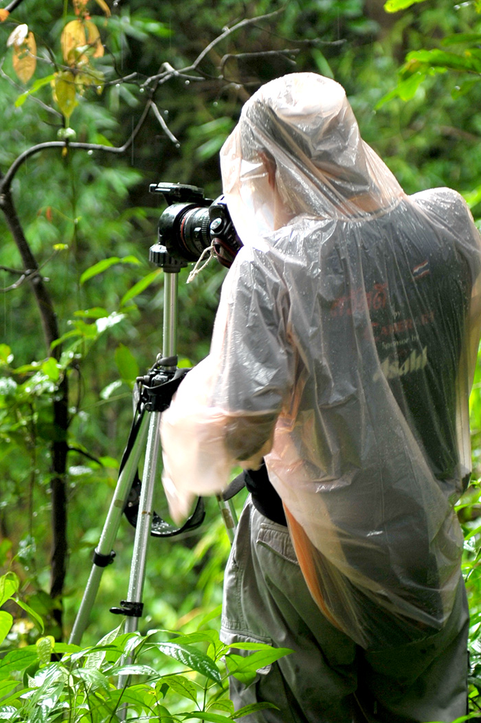 เรื่องแรก อุปกรณ์จำเป็นที่จะต้องพกติดตัว เสื้อฝน ไงครับ เดี๋ยวนี้มีเสื้อฝนแบบพกพาห่อเล็กนิดเดียว หาซื้อได้ทั่วไปที่เซเว่น ก็มีขาย ถุงก๊อปแก๊บ ขอขนาดใหญ่หน่อย เพียงพอที่จะสวมใส่กล้องพร้อมเลนส์ได้ทันทีที่ต้องการ และจะให้ดีอยากถ่ายรูปกลางสายฝน ก็ควรมี ร่ม อีกซักคันติดกระเป๋า  เดี่ยวนี้มีร่มขนาดจิ๋วให้พกพาได้อีกด้วย