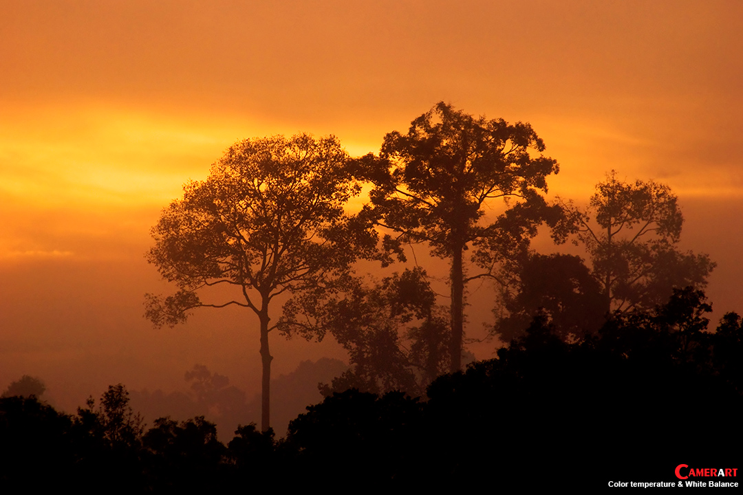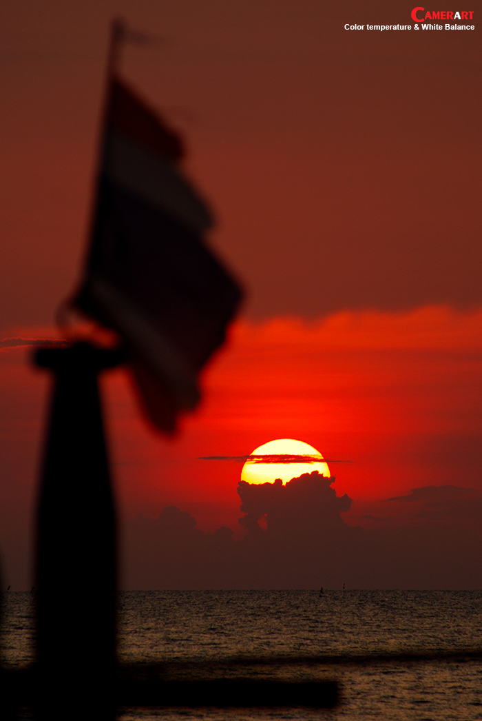 ภาพดวงอาทิตย์ขึ้นและตก อุณหภูมิสีจะอยู่ที่ช่วง 3000-4000K ซึ่งโทนสีในช่วงอุณหภูมินี้จะให้ความรู้สึกอบอุ่น ซึ่งเกิดจากที่แสงจากดวงอาทิตย์ผ่านชั้นบรรยากาศช่างภาพที่ชอบถ่ายภาพ Landscape จะชอบช่วงเวลานี้มากที่สุด เพราะจะให้คุณภาพของภาพ ทั้งทิศทางแสงและโทนสีที่สวยงาม การตั้งค่า WB ในกล้องดิจิตอล ถ้าเราตั้งที่ Auto กล้องจะทำการแก้สมดุลสีแสง ให้ถูกต้องซึ่งมันอาจจะส่งผลให้ภาพมีสีสันที่ไม่น่าสนใจ แต่การที่เราใช้ประโยชน์จากการตั้งค่า WB ให้สูงขึ้น เช่น 5000-7000K หรือเลือกตั้งค่าที่ Daylight แล้วลองสังเกตผลของภาพที่ได้ดูว่าอารมณ์ของภาพเป็นที่น่าพอใจเพียงใด