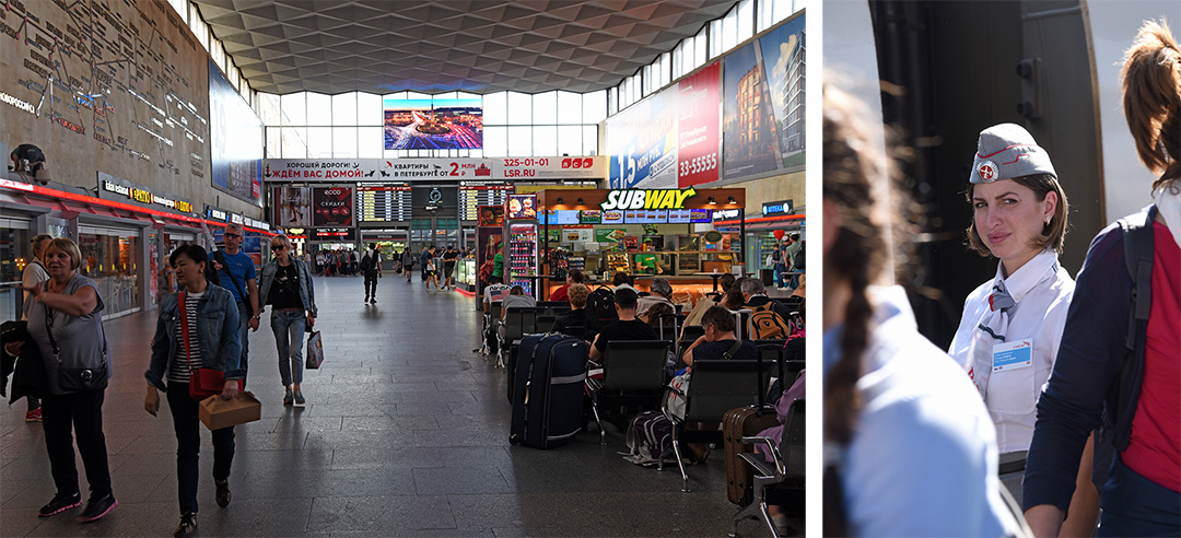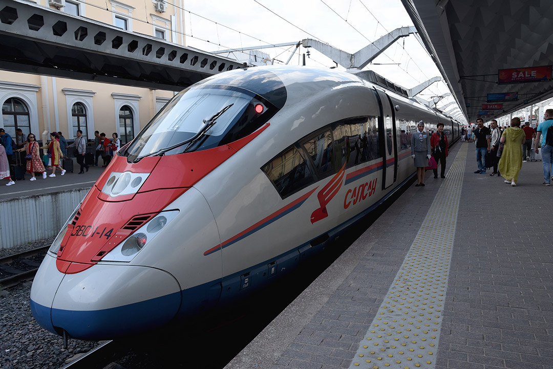 จาก มอสโคว์ การเดินทางมายัง นครเซนต์ปีเตอร์เบิร์ก ทางทัวร์ จัดการเดินทางด้วยรถไฟความเร็วสูงของรัสเซีย ที่สะดวกสบายมาก แต่ดูจากความเร็วของรถไฟที่ปรากฏในจอบนขบวนรถในความเห็นผมแล้ว น่าจะเป็นรถไฟความเร็วสูงแบบปานกลาง เนื่องจากมีความเร็วในการเดินทางเฉลี่ยอยู่ที่ประมาณ 200 กม./ชั่วโมงเท่านั้น ซึ่งต่างจากรถไฟความเร็วสูงที่ผมเคยขึ้นที่ซีอาน ประเทศจีน ที่เดินทางด้วยความเร็วประมาณ 300 กว่ากิโลเมตรต่อชั่วโมง ซึ่งเร็วต่างกันมาก